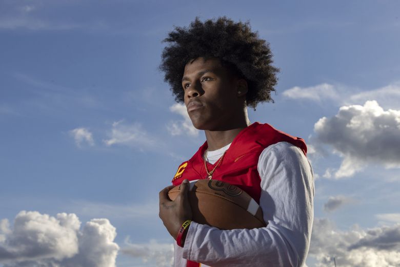1 of 2 | Elijah Durr, a local UW football commit, stands on the football field at Mount Tahoma High School in Tacoma, which he currently attends. He’s embraced Tacoma and the Pacific Northwest after moving up here from... (Ellen M. Banner / The Seattle Times)