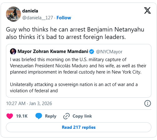 Only Mamdani is permitted to conduct foreign policy and arrest foreign presidents. Typical commie. Rules for thee but not for me.